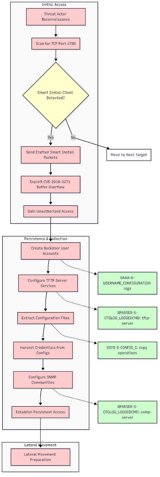 The Static Tundra campaign demonstrates how legacy vulnerabilities like CVE-2018-0171 continue to pose risks to critical infrastructure. Through comprehensive testing on AWS Catalyst 8000V, we have demonstrated that Cisco IOS devices provide extensive logging capabilities for detecting Smart Install exploitation attempts.
