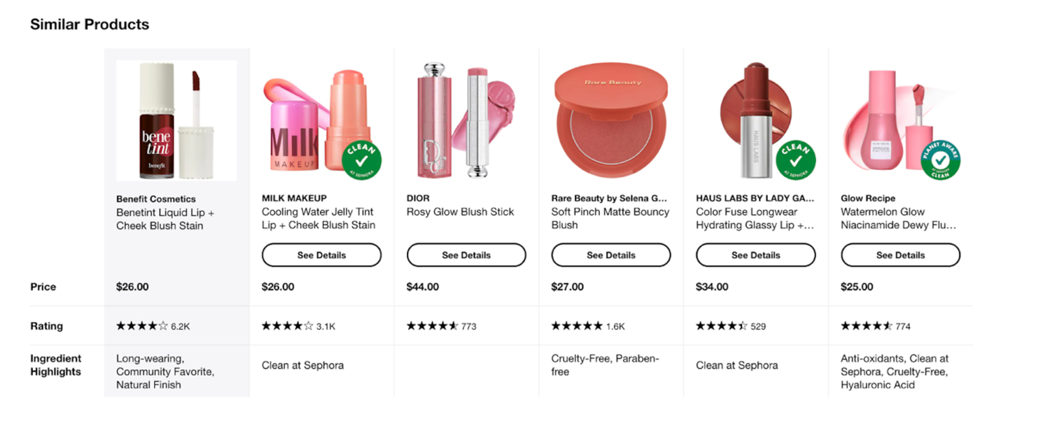For example, when searching for "cheek tints" on Sephora you might notice that, after selecting a product, the site displays a comparison of similar items — showing pricing, ratings, and key features. This makes it much easier for shoppers to make informed decisions without having to browse through endless options.