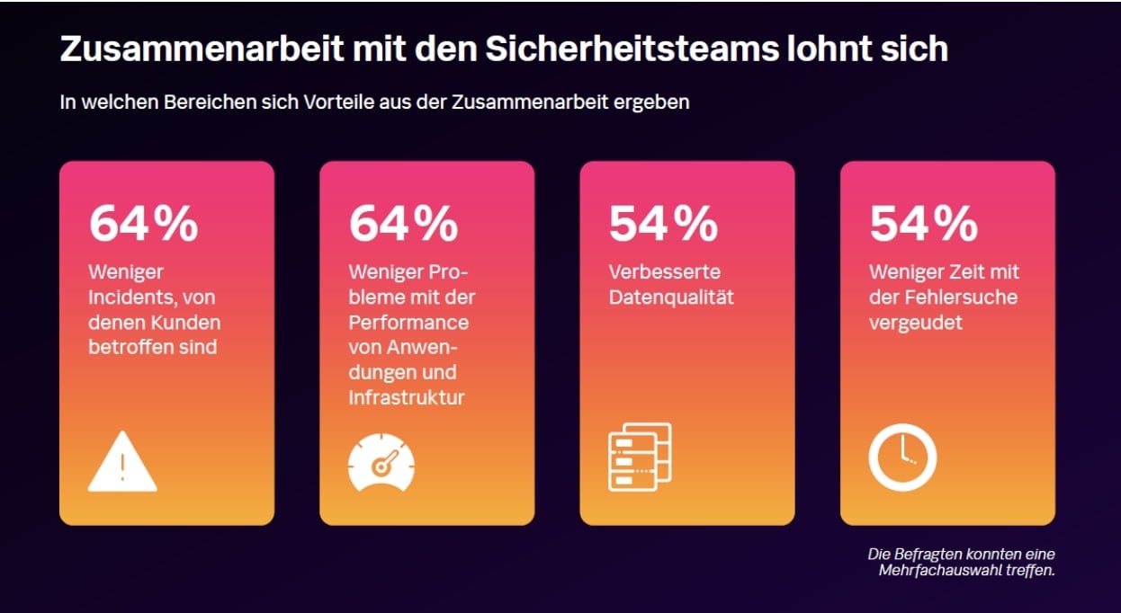 Die enge Zusammenarbeit von Observability- und Security-Teams führt zu schnelleren Problemlösungen, besserer Datenqualität und weniger kundenrelevanten Incidents. 64 % der Befragten berichten von weniger Incidents durch diese Kooperation. 74 % teilen Daten und nutzen gemeinsame Tools, 62 % arbeiten beim Troubleshooting eng zusammen. Diese Synergien sind ein Zeichen für einen hohen Reifegrad der Observability-Praxis.