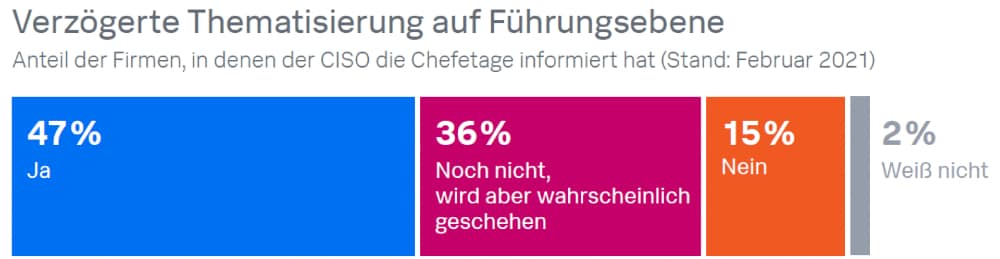 Aber es kommt noch bedenklicher: Zwei Monate nach Bekanntwerden der Hacks hatten weltweit nur 47 % der CISOs die Geschäftsführung oder den Vorstand über mögliche Folgen informiert, in Europa immerhin 52 %. Dass bei der anderen Hälfte die IT-Systeme nicht geschäftskritisch sein sollen, können wir nicht recht glauben.