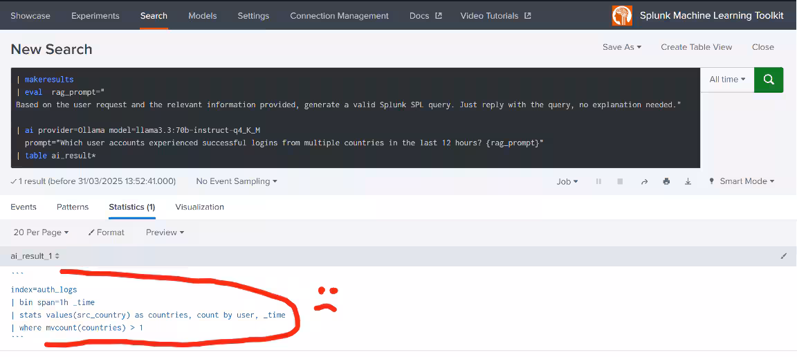 The key point is to leverage LLM's uncanny ability to learn from well-structured examples. With the latest MLTK installed and configured, you can test this capability directly using the Splunk search prompt. Consider this query to list accounts with multiple logins from different countries: