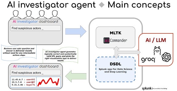 When a user types a request, it gets routed by MLTK / AI Commander to an AI investigator agent. AI agent uses vector DB query to match the user's request to the most relevant data source as well as extracts a number of the most relevant SPL query samples. These results augment the user's query before passing it to LLM for execution.