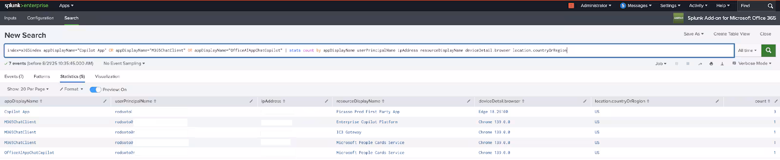 Here is another SPL search analytic that shows origin of devices, user principal name, browser name and version, resource display name and application name. This can give you a good picture of how Copilot is being accessed, from where, via which app and from which region.