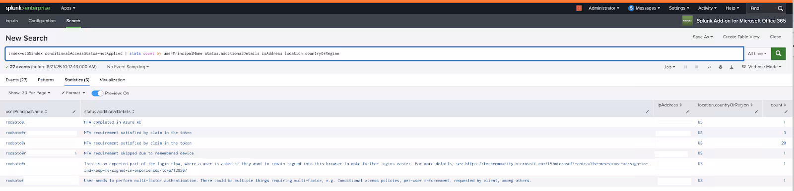 We can now do some basic analytics with this metadata. In the following search we can see a distribution of origin of access, conditional status and reasons for the conditional status. conditionalAccessStatus is notApplied is a strong indicator that there may be a gap in the organization's security policies. An administrator should investigate why policies are not being triggered, especially for access from non-compliant and unmanaged devices. Are there users interacting with Copilot with non-managed or compliant Devices? Are there discrepancies in the origins of users and devices interacting with Copilot? Notice that some additional details are very verbose.