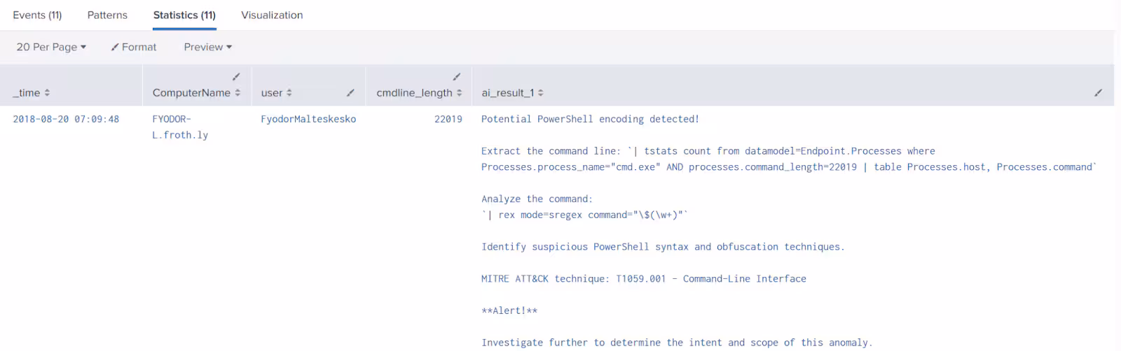 Based on the above items I proceeded to test some detection techniques, some from ESCU and some MLTK algorithms. I used Splunk Boss of the SOC (BOTS) datasets. The following are some examples of the performed queries and the use of the AI feature from MLTK.