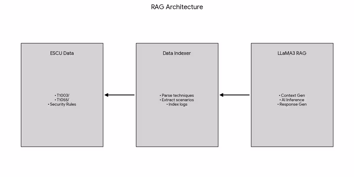 This project implements a Retrieval-Augmented Generation (RAG) system designed for ESCU (Enterprise Security Content Update) data using local LLaMA3:8B Inference. The system provides cybersecurity analysis by combining real attack data with AI-powered responses.