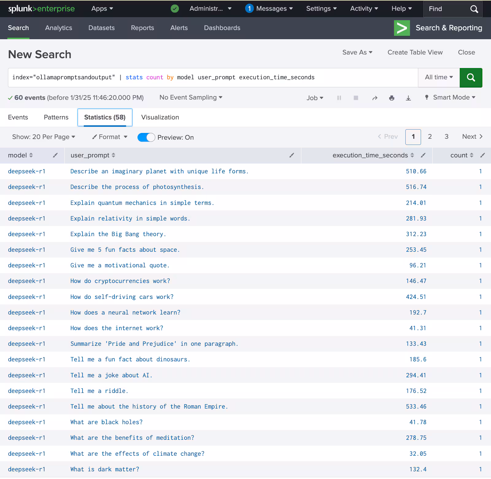 Let’slook at how these logs would look in Splunk. For this demo I created several scripts that interact with Ollama with the objective to obtain parseable logs that can give us useful information on System Messages, Prompts, API calls and Model performance into csv,json files so we can easily import them into Splunk. Dealing with Ollama logs is not easy and requires a bit of maneuvering. You can check my github to see the scripts I wrote for managing these logs.