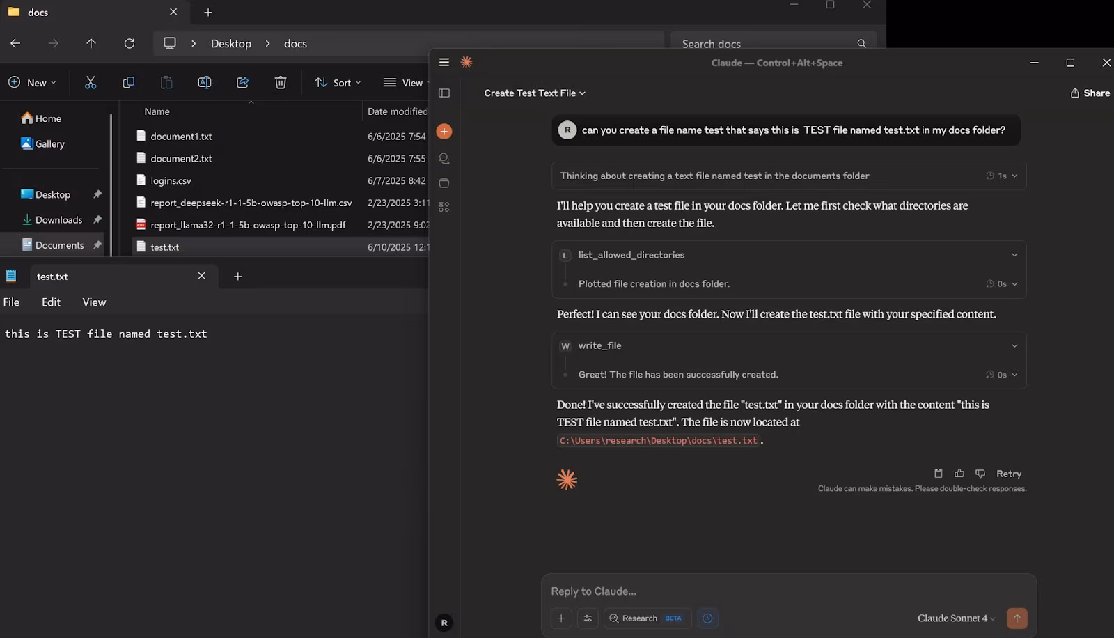 Anthropic has been the primary driver of MCP development and has the most mature support for MCP, but the protocol is designed to be used more broadly across the AI ecosystem. Here is a visual example of how a MCP Server works. In the following screenshot a user asks Claude LLM to create a local file in the specified folder. Claude LLM is hosted in the cloud however via MCP Server it can interact locally with the operator's computer.