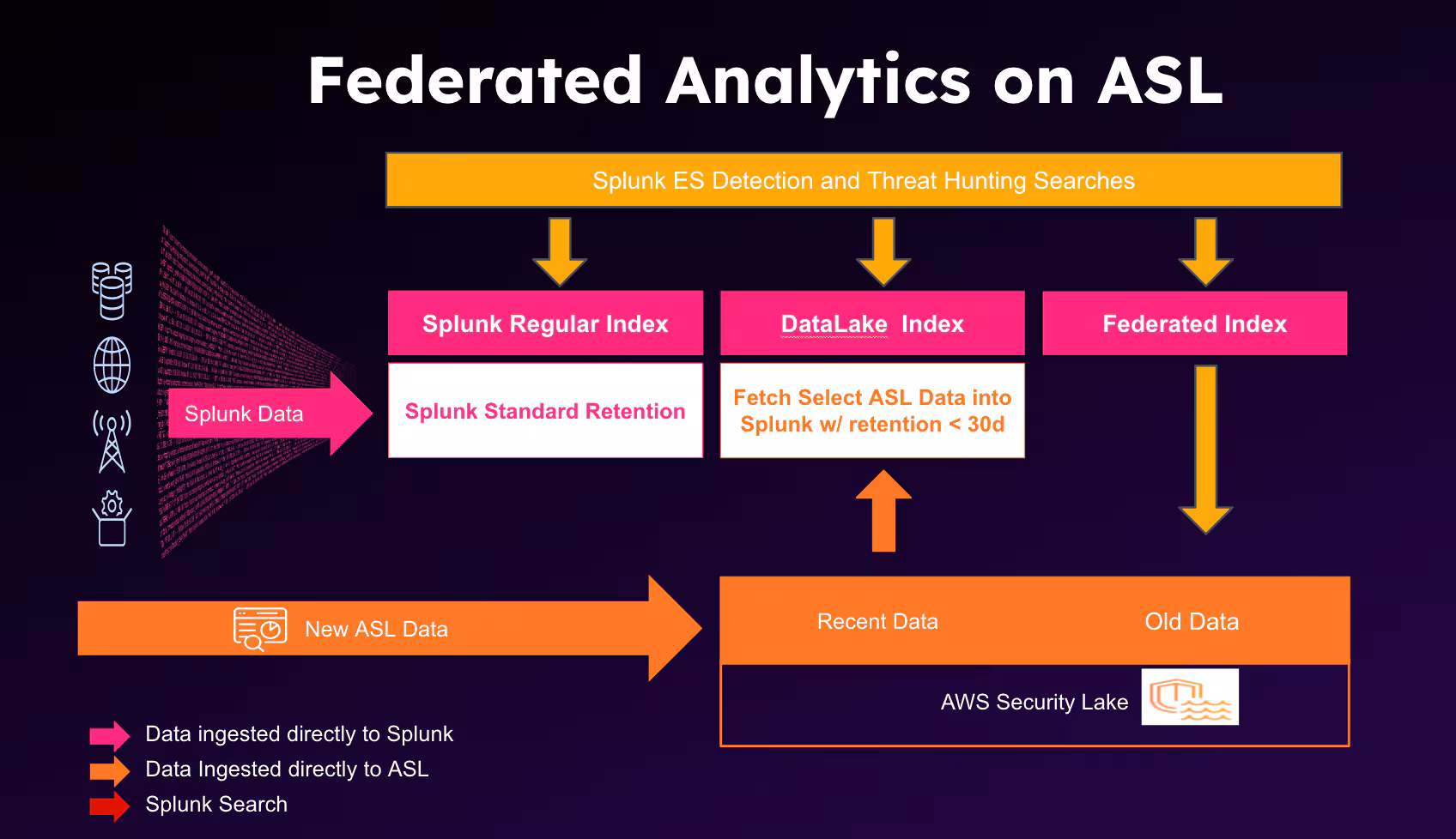 To provide a more balanced and agile approach, Splunk is bringing an innovative offering with the Preview availability of Federated Analytics. Federated Analytics brings an on-demand indexing option for data lakes starting with Amazon Security Lake (ASL), providing both in-place search capability without data duplication as well as a dynamic indexing approach to facilitate low latency searches. This enables organizations to gather context from diverse data sources, and bring selective datasets into Splunk on demand, offering a perfect blend of cost efficiency and low search latency. Organizations can enable their existing apps & workflows including ES detections OOB to be powered through Federated Analytics. This tight integration with Splunk Enterprise Security, OCSF (Open Cyber Security Framework) and Amazon Security Lake enables organizations to immediately gain the benefits of Federated Analytics for security use cases.