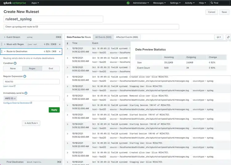 Data masking, filtering and routing are all done with simple clicks — no writing command lines, or hand-writing stanzas in configuration files. A common use case we see for data masking is removing sensitive information such as user names. With the new Ingest Actions feature, you simply click to add a new rule, specify what needs to be redacted, and the expression you want to mask it with. You can iterate quickly and validate rules before deploying it in a distributed environment.