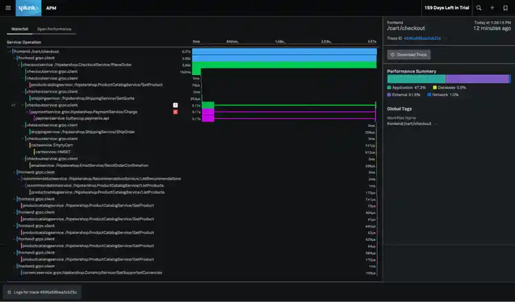 Finally, you can also click on ‘traceid’ with the modal that appears when you hover on the ‘APM’ hyperlink in the session waterfall. This takes you to the exact backend trace that was generated when /cart/checkout was called. It is critical to see the exact backend trace (and not a sampled trace), so that you can understand the exact reason behind slow performance.
