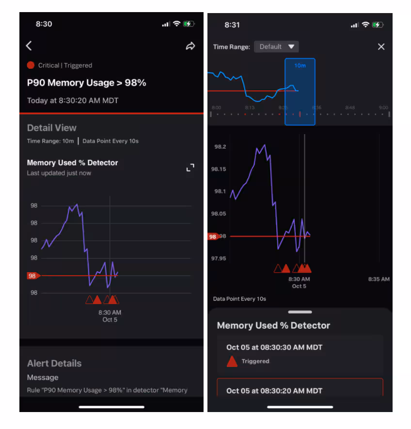In the example above, you see that there are several critical alerts that require immediate attention. Tap the alert to view critical alert details and get quick context and insight into incidents. You can then mark them as cleared once you’re ready to resolve them. If the alert requires immediate attention, drill down into the alert data and view detailed visualizations about what happened at the time of the incident so you know where to start.