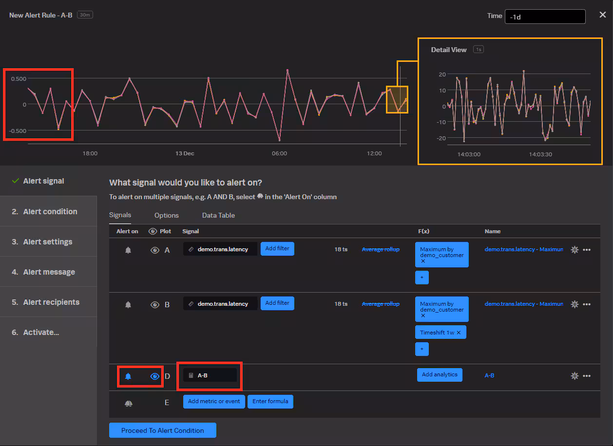 Now, we’d be able to calculate the difference between the first two plot lines by adding the formula A-B (value of plot line A (current) minus the value of plot line B (last week)). We want to see a negative value; the bigger the number, the worse the latency is compared to last week. Once the formula is in place, we can set the new variance calculation metric as the dataset we see in the time chart and the value to alert on by toggling the eye and bell icons. We can also verify that the new metric has gone from showing us the actual latency numbers to just the difference since the Y-axis should now be in decimal increments.