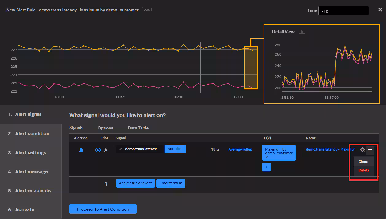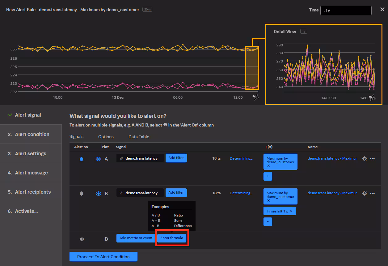 Once we’re on the New Alert Rule screen, the first thing we’ll need to do is identify the metric(s) we want to monitor. When it comes to working with metrics and signals in Splunk Observability Cloud, we use ‘plot lines’ to define and correlate between different datasets. Each plot line can act as an independent stream of a metric and its associated dimensions, or those plot lines can be evaluated against one another to compute a new output altogether. For this example, we’ll be looking at service latency for our customers, comparing it to the previous week, and setting it to alert us if we see trends that indicate regression in our user experience. Ideally, we should be improving latency for end users, not going the other way! We’d start by taking a sample service latency metric, aggregating it down to each of the customers, and performing basic functions to determine the weekly variance for latency.