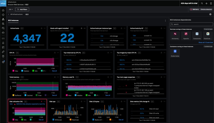 The EC2 dashboard displaying all of the out-of-the-box metrics, and indicating critical disk space issues