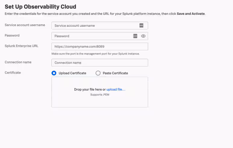 Setup would continue in Splunk Cloud. To configure the Splunk Cloud service account user, you must also have the sc_admin role in Splunk Cloud Platform. You’d follow the instructions in the guided setup to configure a role in Splunk Cloud Platform for the Log Observer Connect service account.