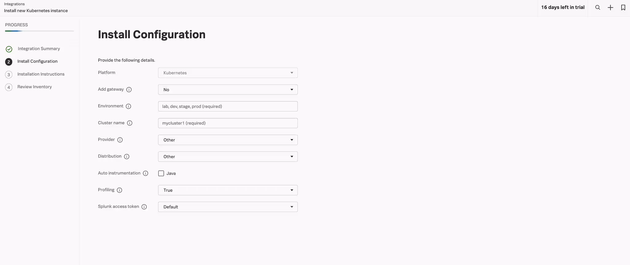 Install Configuration where you select the desired values for Environment, Cluster name, Provider/Distribution, Log Collection & Auto-Instrumentation/Profiling.