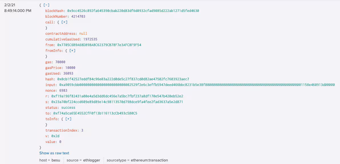 Logs can be delivered to Splunk directly through simple configuration steps as JSON objects that offer rich parsing and querying capabilities.Besu instruments all incoming JSON-RPC calls through tracing, reporting all interactions and the JSON-RPC method called. We also instrument critical processes such as the block processing time.
