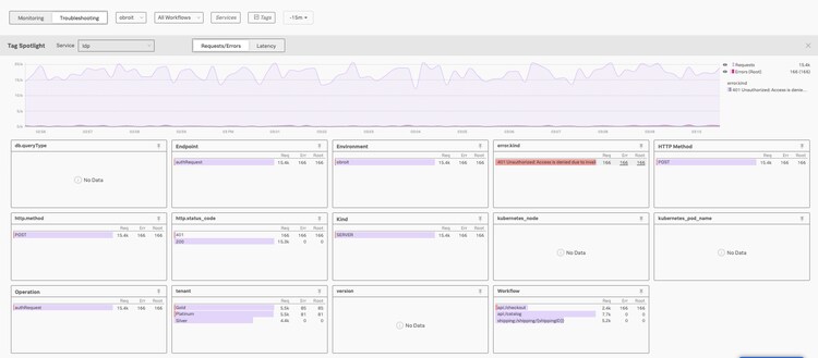 With these capabilities, once there’s a problem with a business workflow, SREs can use Tag Spotlight to quickly see which service is causing it, who is impacted and involve only the relevant team instead of having everyone waste their time by joining a war room. The developers in charge of the problematic service can then use Tag Spotlight themselves to quickly understand what caused the issue and start troubleshooting it.
