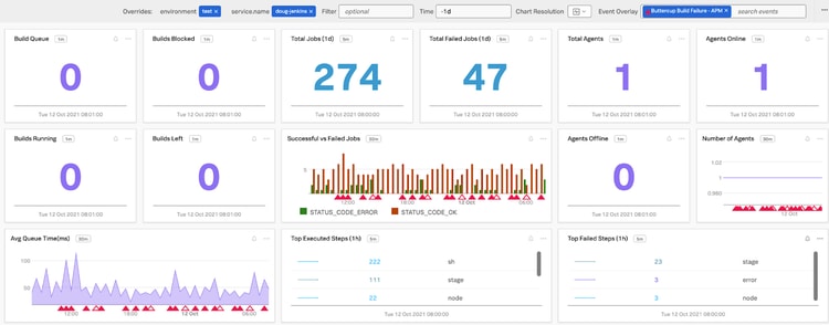 Figure 1-2. Overall Jenkins Health: Observe valuable Jenkins agent, build queuing, and even detailed step metrics (with Log Observer) at a glance.