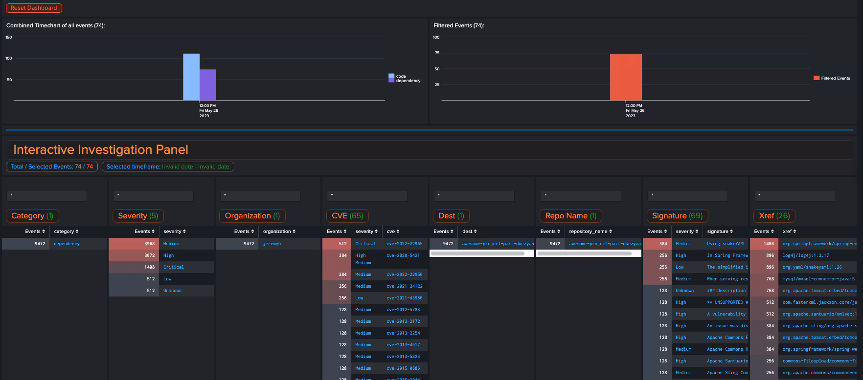 Figure 1-3. Visualize dependencies, vulnerabilities, and other CI related data in highly detailed Splunk Dashboards like the above for analyzing Code Scanning and Dependency Scanning vulnerabilities.