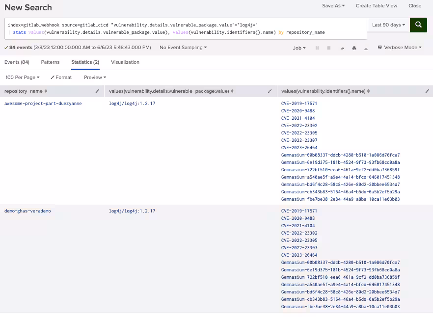 Finding all repositories using a specific package (Log4J anyone?) is a snap! Simply search your GitLab CI data in Splunk for the vulnerabile package you’re interested in and use stats by repository name. You’ll easily be able to see the current usages associated with that package and if needed, can easily locate the vulnerabilities identified in that dependency.