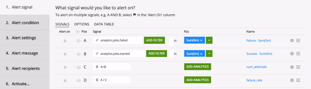 As explained in this post, one problem with simple “signal above threshold for duration” alerts is that they may fire while the signal is heading back towards the healthy state and intersects the threshold, so the alert rule does not perfectly align with the problem scenario one intends to capture. A solution proposed and implemented (by a somewhat alembicated method in the plot builder) in that post is to add a condition on the rate of change of the signal. For example, we can simply require the signal’s rate of change to be positive, in addition to the threshold being exceeded for some duration. It is now straightforward to accomplish this task in the SignalFx UI: in addition to the original signal one intends to monitor (say it’s plot "B), in the Alert signal tab we also create the rate of change of this signal by adding analytics.