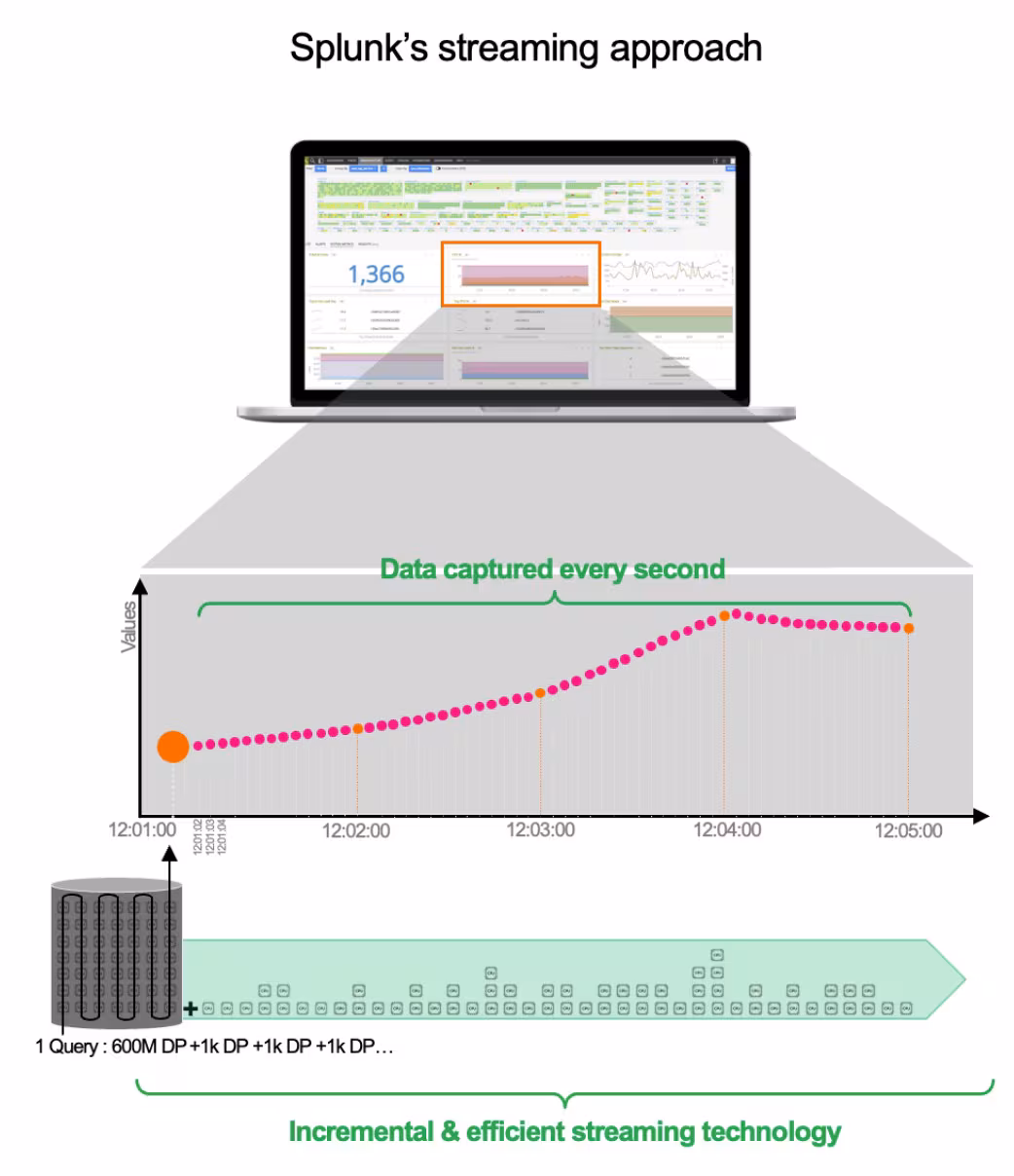 At Splunk, we decided to use a streaming architecture. Of course, when the service starts, we also need to fetch the first 600M data points, but we will not generate a new large query a minute later. Our query remains. We simply update it every second with the new data (in increments of 1K data points ). Not only is it more efficient and much more scalable and faster, but it also guarantees you to capture everything, from impatient customers to functions with memory leaks etc. But it doesn’t stop there. It gets even better. Do you need to change the view? Do you want to average the total? Don’t worry we precalculate some data in the backend for even more efficiency.