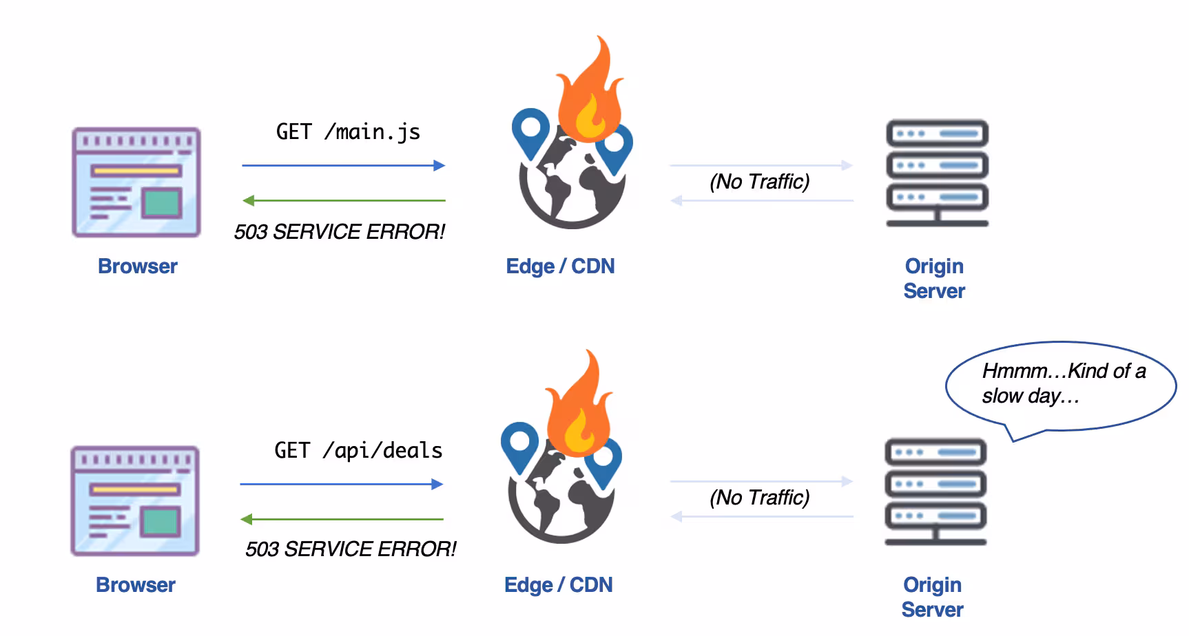 In the diagram below, we can see how the CDN sits between the site visitor and the origin server. When the browser requests main.js, the CDN already has a copy, and returns it more quickly than the origin server would have. When the browser makes an API call, the CDN passes that request through to the origin server.
