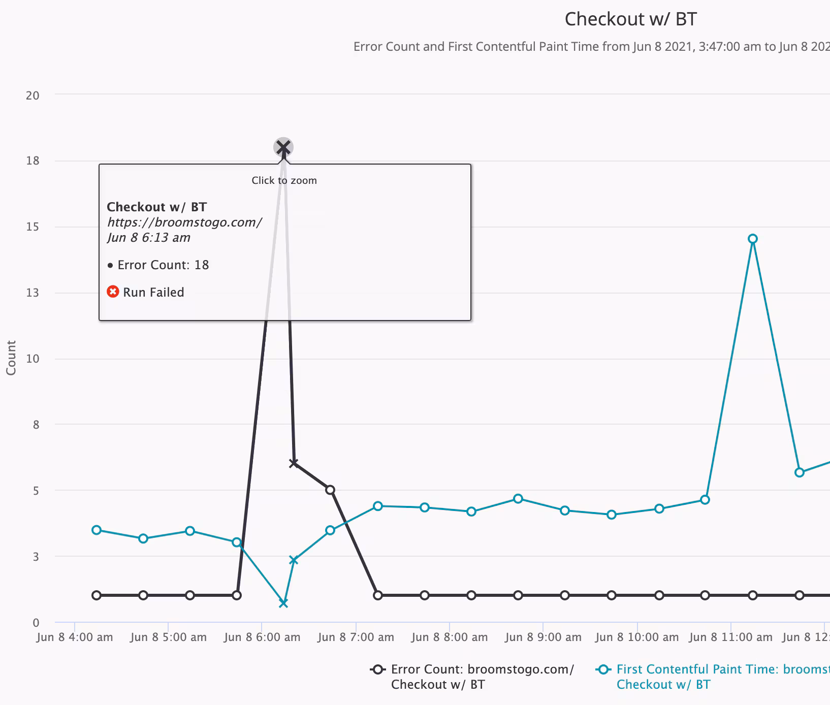 In the screenshot above, the teal-colored line represents the First Contentful Paint and the black line shows the count of browser errors encountered while downloading resources. We can see that at the moment when the outage started, assets such as CSS and JS failed to load, thus increasing the error count. Meanwhile, the paint time actually improved, because all those request failures meant there was less content to draw!