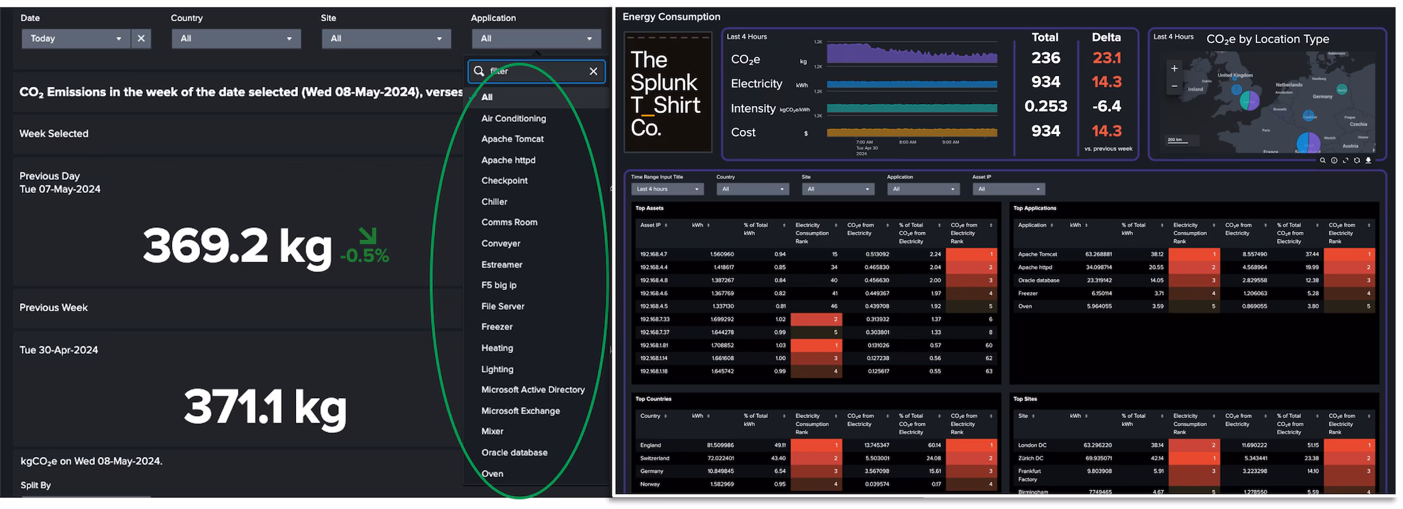 The Splunk Sustainability Toolkit can allow for very granular CO2 analysis, from application level to specific data center hardware components, as shown in the dashboards below.