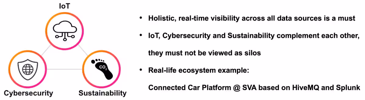 Splunk, SVA and HiveMQ have teamed up to demonstrate the friendship of IoT, Cybersecurity and Sustainability with a real-life example of a Connected Car Platform.