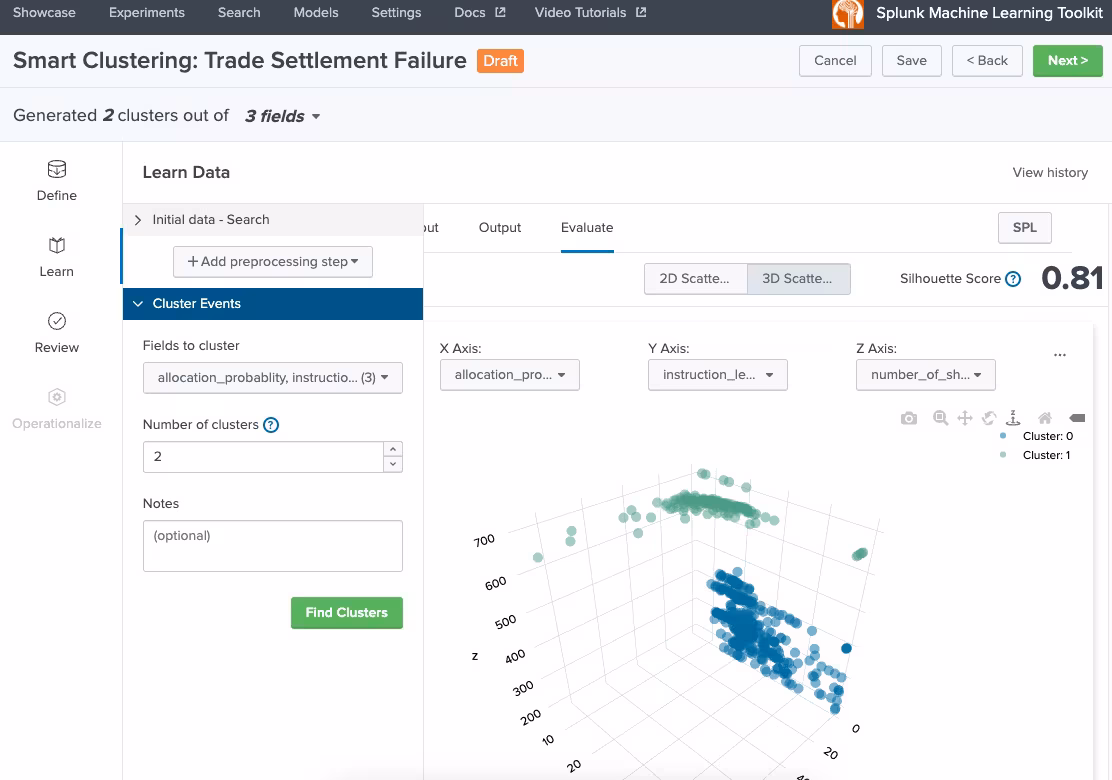 I am going to pause from our goal to introduce another way to partition out which trades should go to the trade issues index. Boolean logic may work very well, but one can also use machine learning to cluster trades by their characteristics. Without getting too much into the detail, what I’ve done below is used the Splunk MLTK to create a model that clusters trades by 3 features: number of shares, length of instructions, and a priori knowledge of allocation probability. Based on this, we can then collect the trade IDs for one cluster to send to the trades issues index to be applied to our category predictive MLTK models. In real world situations, the number of fields that can influence the failure of a trade will be a lot more than three, but three were used here as an example. I realize that allocation probability is a feature that may not exist, as it in itself may require machine learning to compute, but I use it here for illustrative purposes.