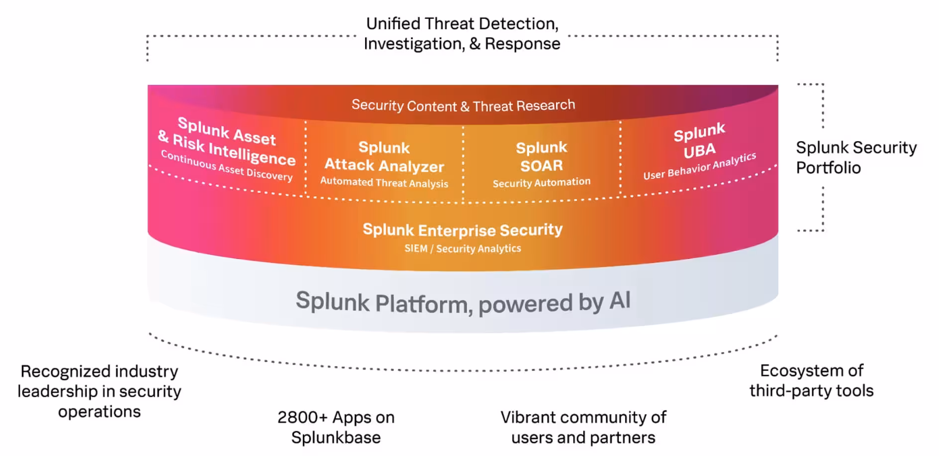 Splunk is a recognized leader in cybersecurity with its market-leading SIEM Splunk Enterprise Security and a deep security portfolio as shown in the image below - adding breadth and depth together with Cisco.