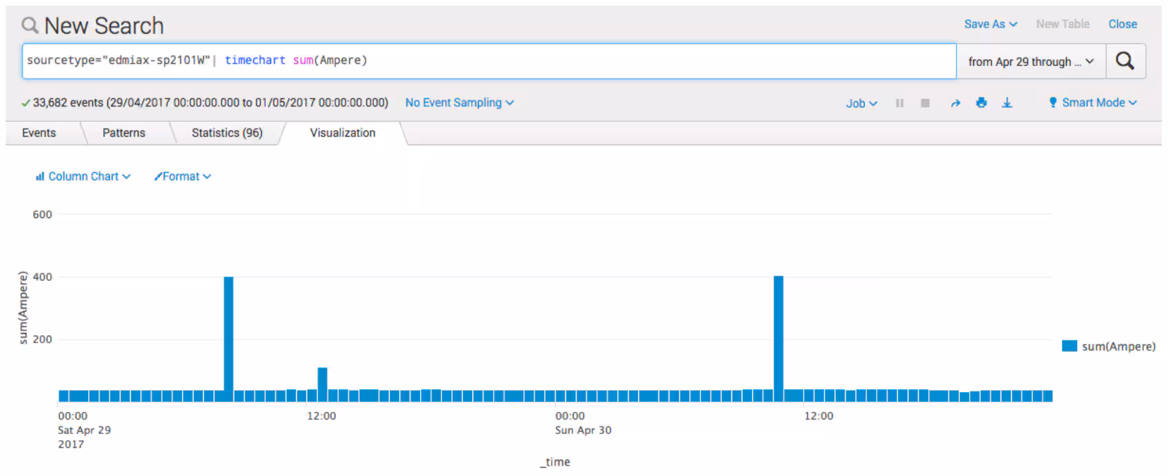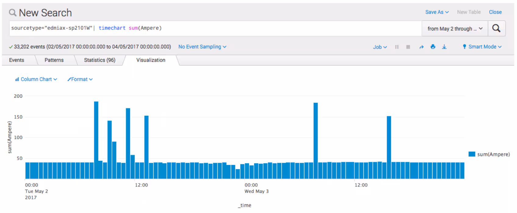 Next, I created a timechart and calculated the used Ampere, as there is a higher consumption if the machine is on and running. So you can see already a clear trend; five cups of coffee from the morning of May 2nd to lunch is a typical home office day. You can also see that on the next day I was apparently more alert, and reduced my coffee consumption.