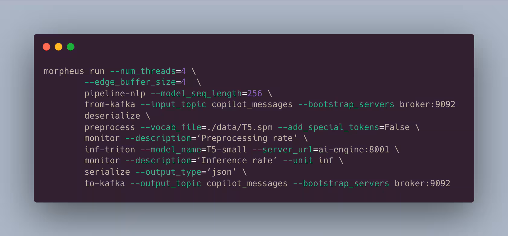Once the stages are ready, the Morpheus pipeline can be built via CLI. Under the hood, Morpheus will efficiently take care of the orchestration, management of all resources (CPU/GPU/Network), communication between distributed pipelines, and monitoring of the throughput and model drift over time. It automatically adjusts buffer sizing between stages to optimize hardware saturation, maximize throughput, and minimize latency. The backend engine is in C++ for optimized performance, but there is an easy-to-use Python interface.