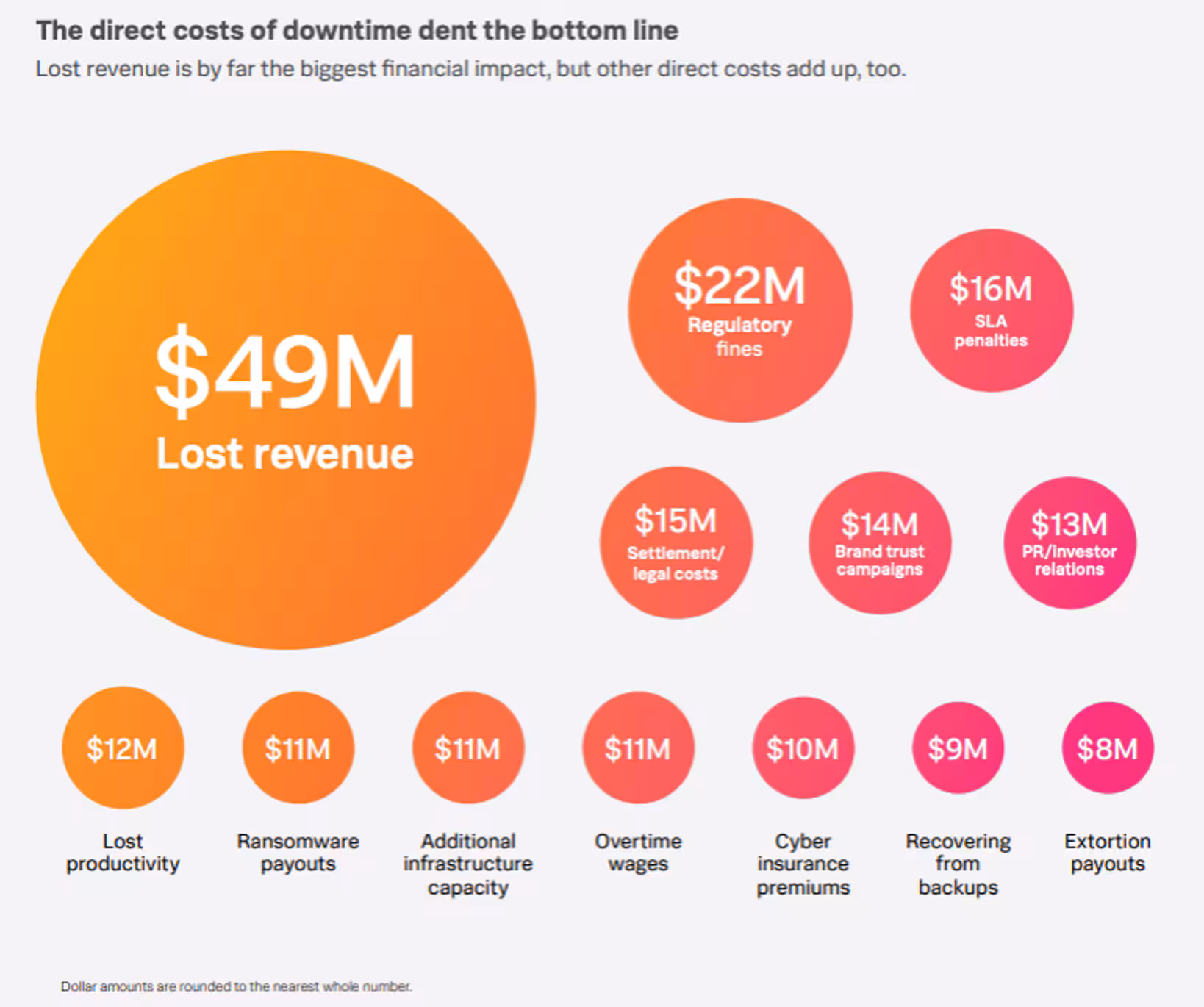 - Lost revenue. Companies experience direct financial losses, with some organizations losing millions for every hour of downtime. Lost revenue is the most significant direct cost of downtime, amounting to $49 million per year.