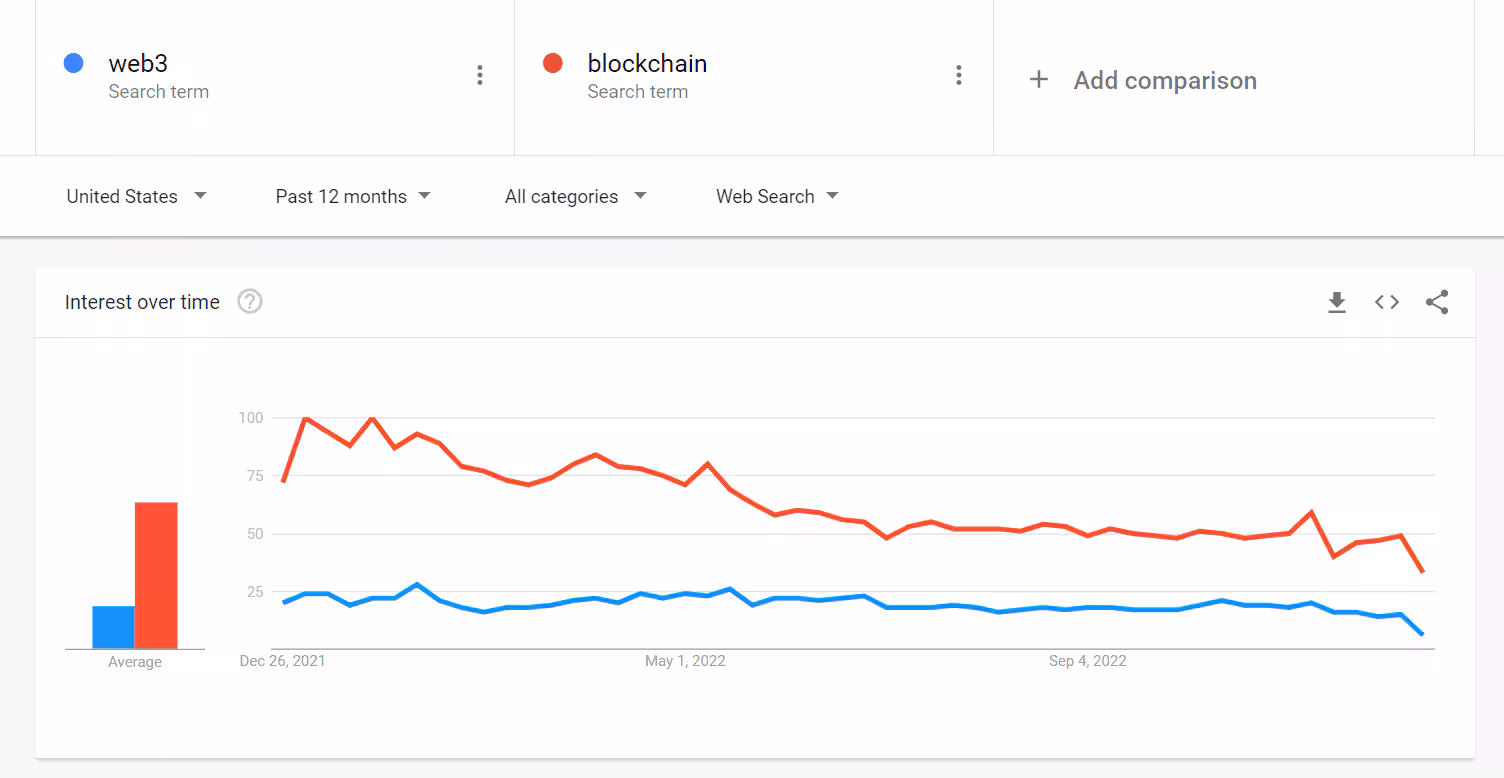 As of the writing of this post, Blockchain and Web3 are both in steep decline in Google search interest, per Google Trends.