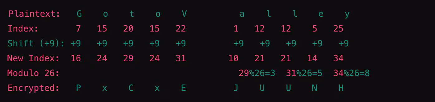 Let's encrypt the phrase "Go to Valley" using the Caesar Cipher with a key of 9.