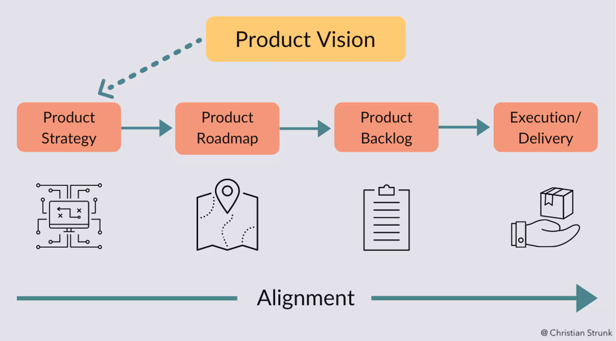 This diagram from renowned product coach Christian Strunk shows how the product vision lays the foundation for other activities in the product department: