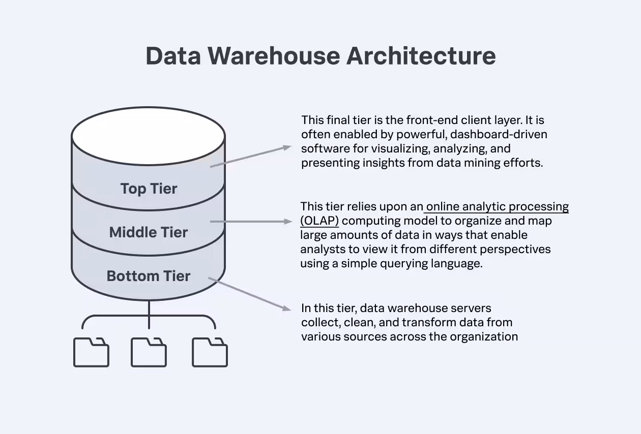 - Bottom tier: In this tier, data warehouse servers collect, clean, and transform data from various sources across the organization. Metadata is created during transformation to speed search and query. Meanwhile, ETL processes help aggregate the processed data in standardized formats.