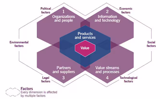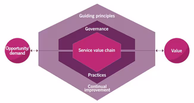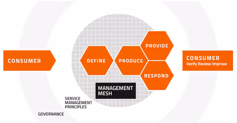 This model includes governance, service management principles, and the management mesh which allows for flexibility and integration of multiple management practices that an organization can exploit to find the way that creates most value for them and their consumers.