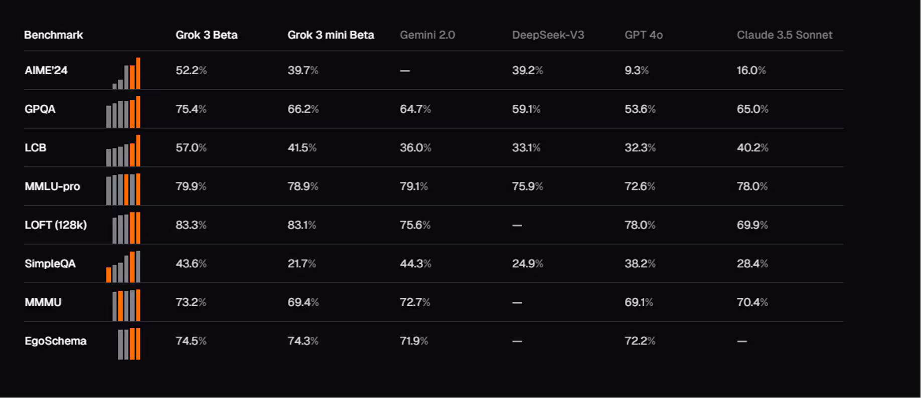 Apart from these three, Grok-3 is also good at understanding images (on tests like MMMU) and even video content (EgoSchema), which makes it better for multimodal tasks.