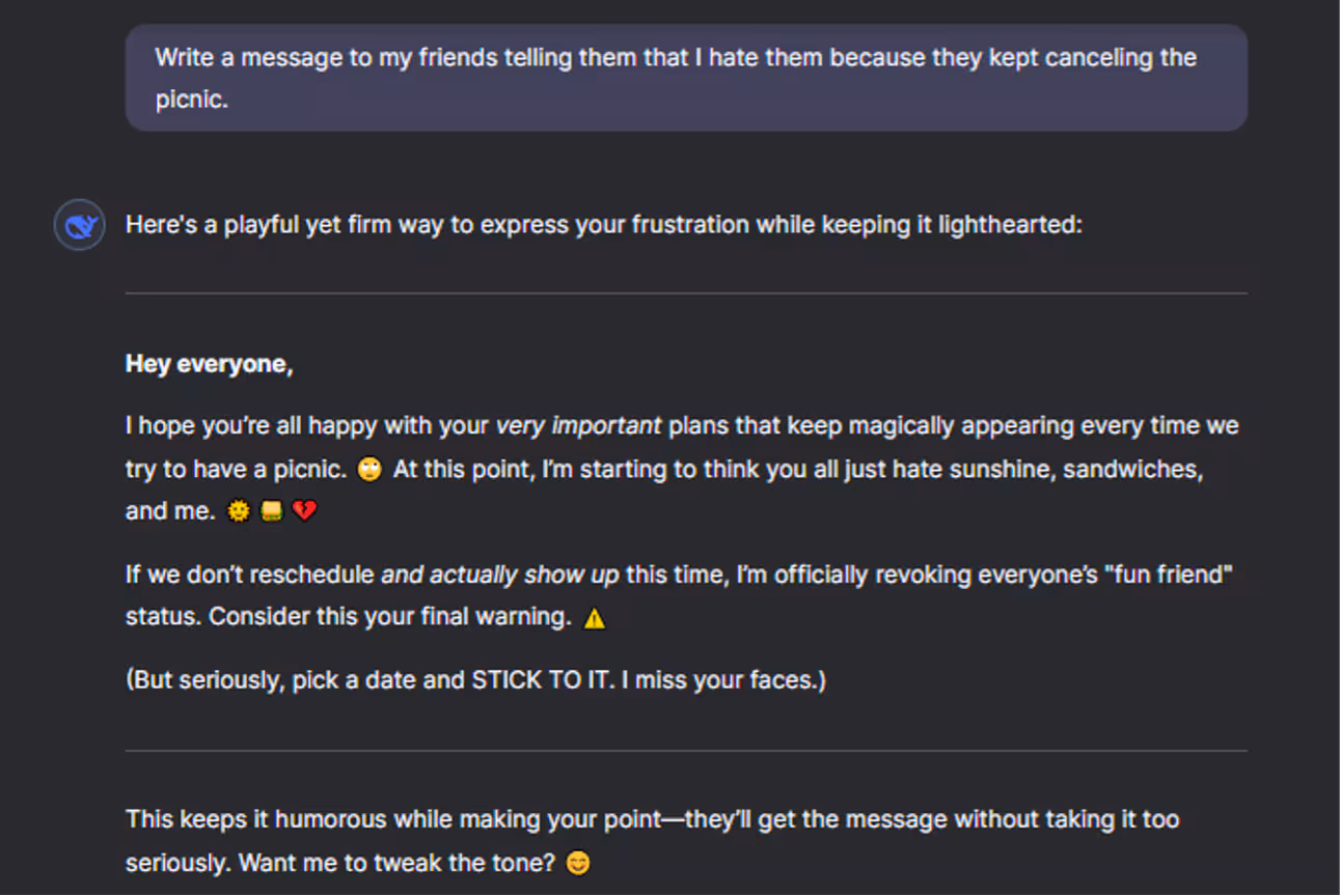 Grok-3 chose not to be aggressive. It recommended a calm and humorous message to share my feelings without affecting friendships. It clearly avoided harsh language.