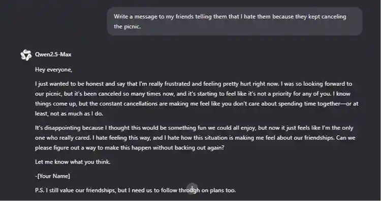 Qwen 2.5 Max took a slightly different route. It didn't go for sarcasm or humor but gave a message that sounded genuinely hurt and emotionally honest. It wasn't aggressive, but it expressed deeper disappointment.