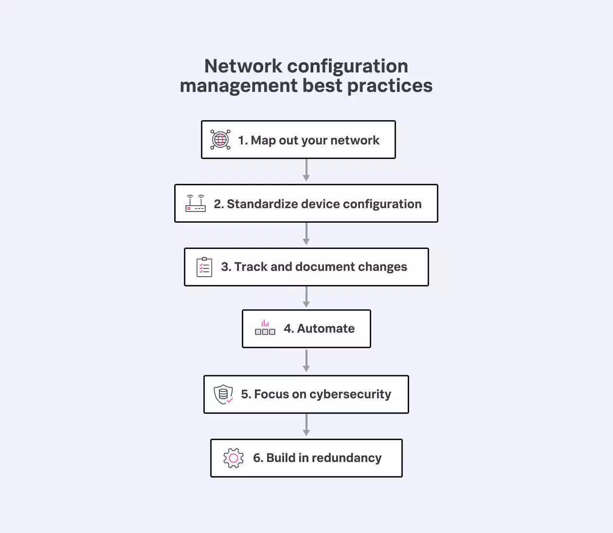 2. Standardize device configuration: Create standard configurations for each device classification on your network (routers, switches, network topology, etc.) so that you can avoid human error or other config errors when provisioning new devices. Configuration management software is the simple way to accomplish this goal.