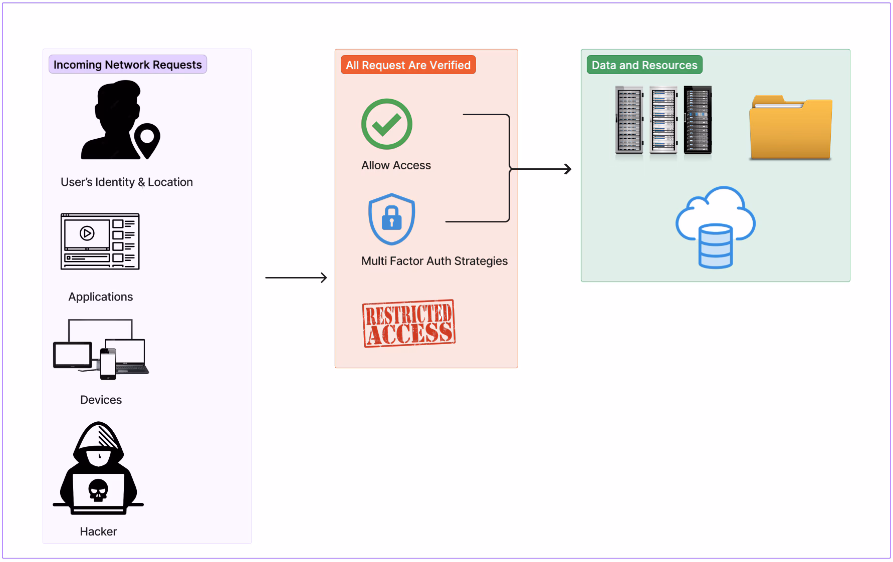 Implementing a Zero Trust architecture depends on many variables based on your current network setup. In a Zero Trust security model, access to a network is achieved based on a user’s or device’s identity, location, and permissions. A comprehensive guide to getting started is beyond the scope of this post, but below is a high-level overview of how it works.