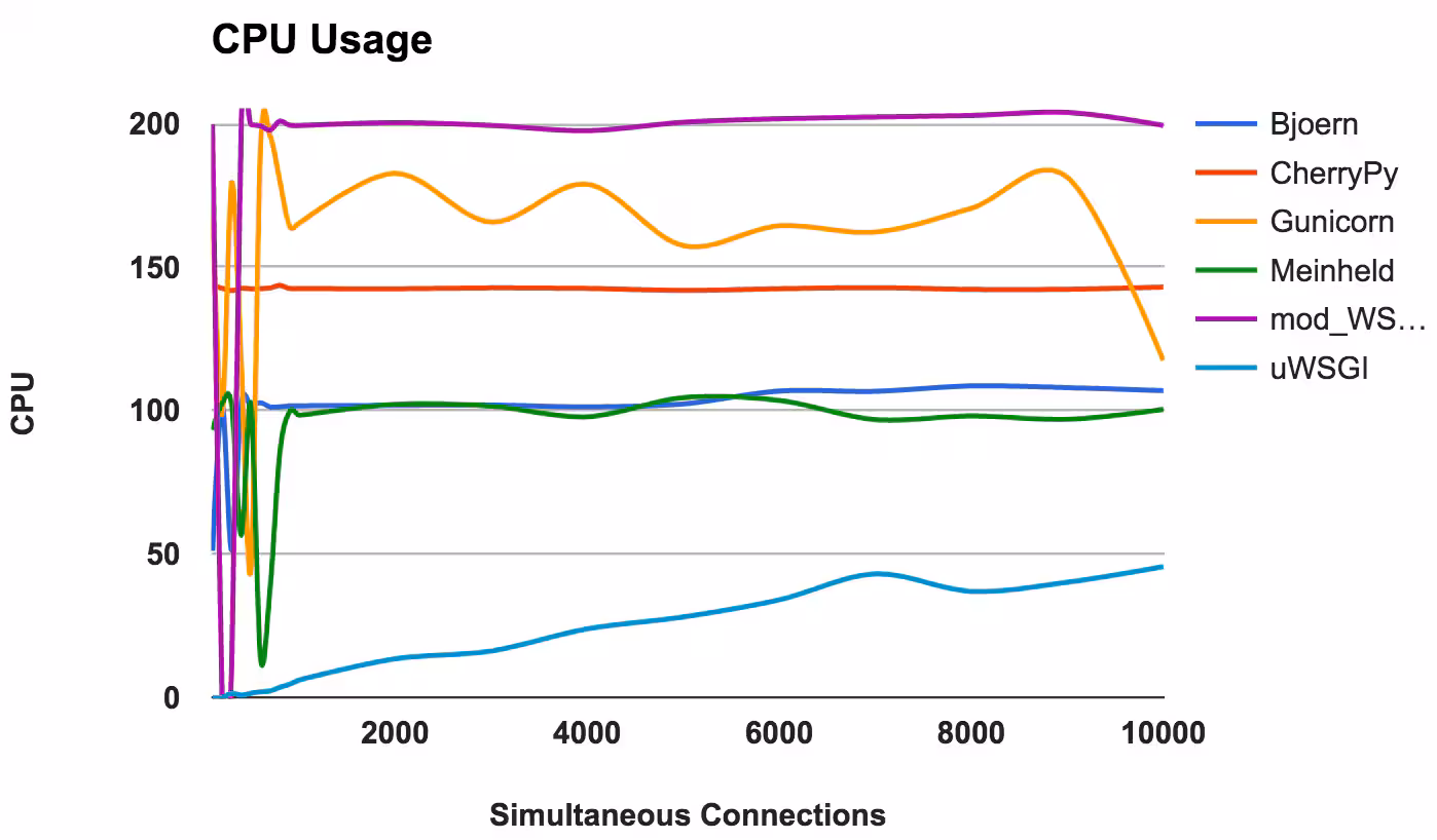 - Meinheld: Single-threaded server, with similar CPU utilization as Bjoern.