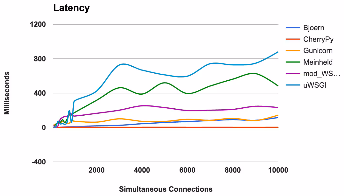 - Meinheld: Overall, acceptable performance, but it struggled as simultaneous connections increased.