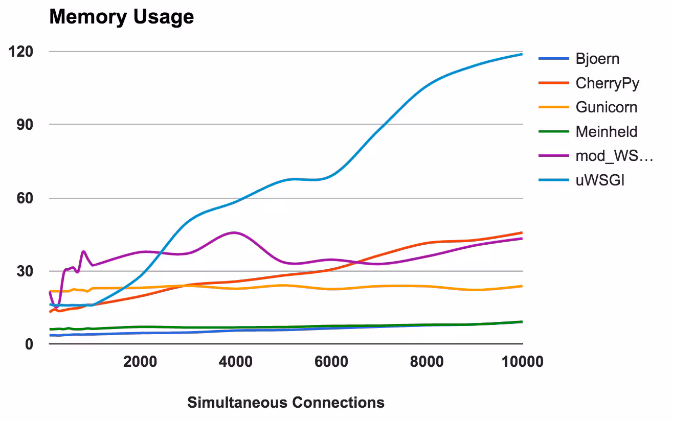 - Bjoern: Extremely lightweight, only requiring about 9MB of RAM to handle 10,000 concurrent requests.